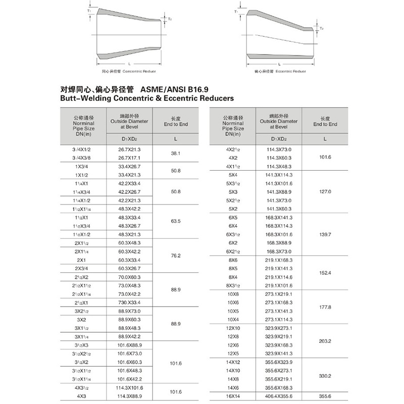 | Standards | ASTM A234、ASTM A350、ASTM A335、EN10253-2、EN 10253-3、EN 10253-4、ASTM A420、ASTM A860、ASTM A403、ASME B16.9、MSS SP-75、ASME B16.11、MSS SP-97、MSS SP-95、GB/T 12459、SH/T 3408、SH/T 3410、GB/T 14383、GB/T 35072 | |||||