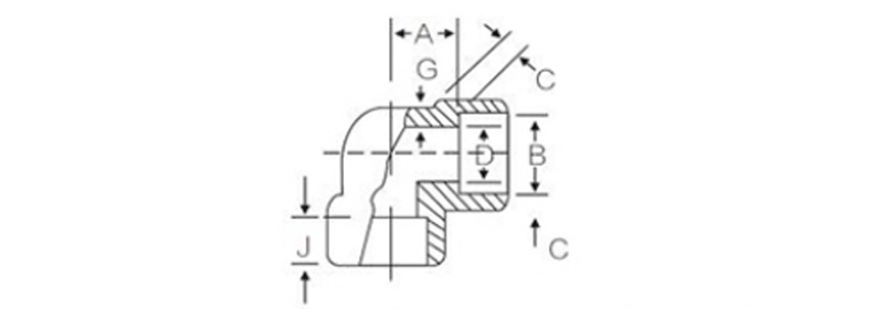 | Corresponding national standard title | Corresponding to the United States standard name | Supporting copper pipe outer diameter (mm) | Socket inside diameter B | Outside diameter | Jack depth J | Total height | Wall Thickness C | Through hole bore D | Body wall thickness G | Center to socket bottom (not shorter than)A | Weight (KG) |