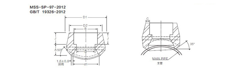 | Nominal diameter of branch pipe | Applicable supervisor nominal diameter | A(Max.) | D1(Min.) | D2(Min.) | D | d1 | C(Min.) | B | J(Min.) | ||||||||